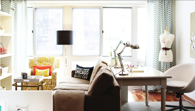 Her desk/workspace is behind the couch in the living room